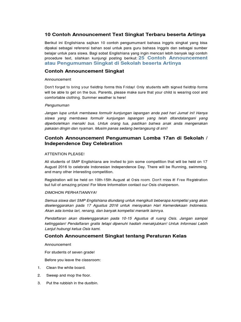 Contoh pengumuman di sekolah dalam bahasa inggris dan artinya. Jenis pengumuman ini dibuat oleh sebuah tempat yang berbadan hukum (perusahaan, sekolah dan tempat lainnya) agar diketahui dan dipatuhi olehj . Pengumuman dalam bahasa inggris tentang perubahan nama perusahaan. Suatu perusahaan ketika membuka lowongan pekerjaan biasanya memakai. Kehilangan atau kerusakan bukan menjadi tanggung jawab perusahaan.